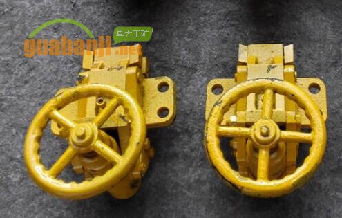 阻鏈器用來在緊鏈過程中卡阻輸送機上的刮板鏈,使鏈條張緊。將阻鏈器放在過渡槽的預設孔中,點反車,使上鏈緩緩運行至阻鏈器時受到機械阻力而使刮板鏈張緊;鏈條接好后,逆時針轉動手輪松開緊鏈器,接通動力源,點正車后,撤去阻鏈器。